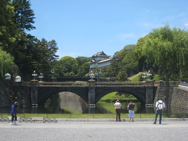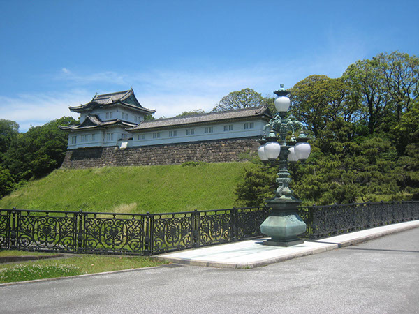 振り返ると、橋の向うには伏見櫓。この櫓は三代将軍家光が寛永5年(1628)に京都伏見城から移築したと伝えられています。再び宮殿へ戻り、外国の賓客が使う南車寄の前を通り、一般参賀の際に皇族方が立つお立ち台は毎回設営すること、有田焼の灯篭などの説明を聞き、松の塔(照明塔)、北車寄を経て山下通りへ。春は桜、秋は紅葉がきれいとのこと。新緑と木の葉を吹き抜ける涼風が心地よかったです。宮内庁庁舎前から蓮池濠を見て窓明館へ戻り、一般参観は終了。