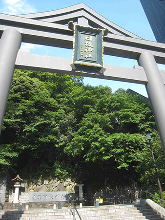 溜池から赤坂見附方面に歩き、上りのエスカレーターに一部の参加者が感謝して登り、山王日枝神社へ。ここは江戸城の裏鬼門にあたるそうで、もとは城内にあったものを、二代将軍秀忠のころ城外に移り、明暦の大火後に現在の地へ移ったとのことです。日枝神社特有な形状の山王鳥居が目印です。
