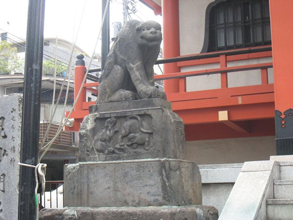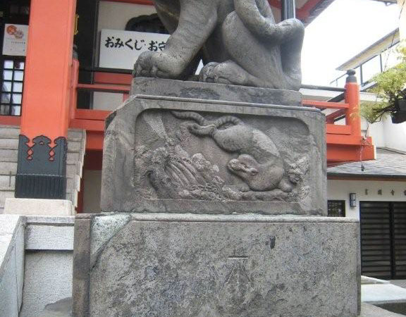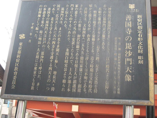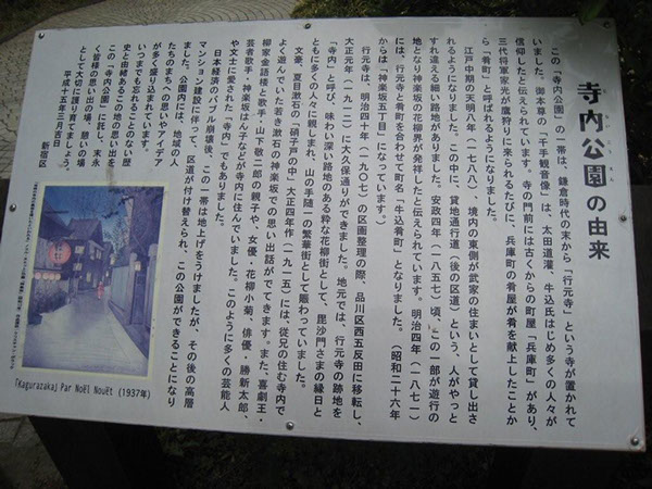 神楽坂を登り、毘沙門天へ。神楽坂の通りに面した毘沙門天は善國寺というれっきとしたお寺ですが、明るい感じの建物から神社と間違う方もいるとか。通りを渡り、入り組んだ細い路地に往時をしのばせ、黒塀の料亭がある本多横丁・かくれんぼ横丁・芸者新道へ。神楽坂が三業地として発展したもととなったという行元寺跡にできた超高層マンション脇の寺内(じない)公園で記念撮影。