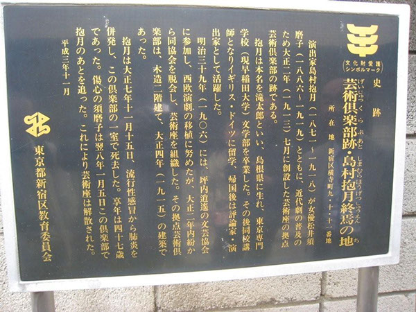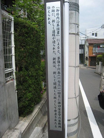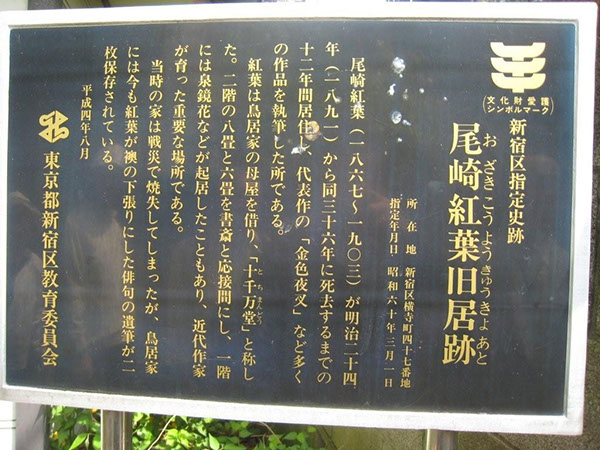 再び神楽坂を登り、島村抱月・松井須磨子の芸術座跡を見学、かつての寺町の面影が残る通りを歩き尾崎紅葉旧居跡へ。渡辺さんから『金色夜叉』が紅葉自身の体験をもとに書いたものという説明を聞き、あらためて神楽坂が明治・大正・昭和の文学に縁の深い地ということに気付きました。