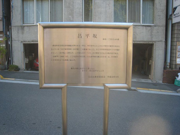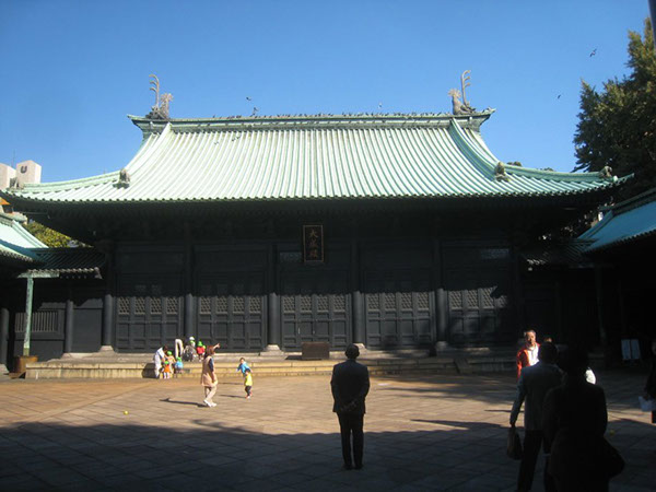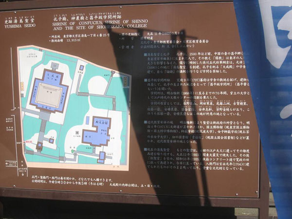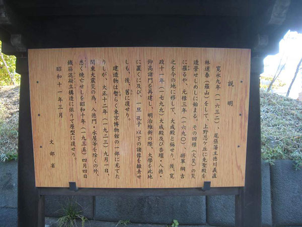 神田川に架かる聖橋を渡って北側の湯島聖堂へ。聖橋の名前は、南のニコライ堂と北の湯島聖堂の二つの聖堂を結んでいるところからつけられたそうです。湯島聖堂は、寛永9年(1632)に林羅山が上野忍岡に建てた孔子廟を、元禄3年(1690)に徳川幕府5代将軍綱吉がこの地に移したものです。寛政9年(1797)に敷地を拡張して昌平坂学問所を開設し、幕府の学問所として江戸時代の大学の役割を担っていました。現在の建物は関東大震災の後、昭和10年(1935)に再建されたものです。黒塗りの重厚な孔子を祀った大成殿の前で、近所の保育園の子供たちが遊んでいました。