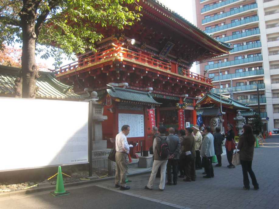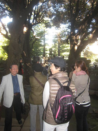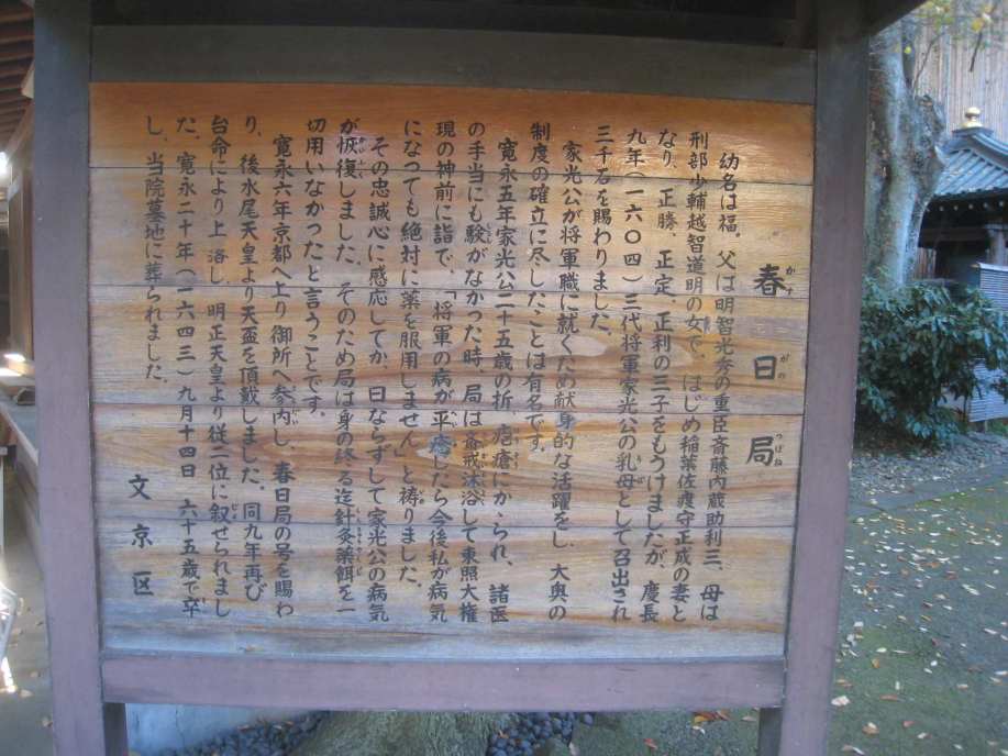 神田明神から坂を下り、蔵前橋通りを渡り、また坂を登って湯島天神へ。学問の神様菅原道真を祀る神社の境内では、菊まつりが催されていました。泉鏡花の『婦系図』「湯島の境内」でも有名な湯島天神をあとにして、春日通を歩きその名のもとになった春日局が眠る麟祥院へ。春日局は3代将軍家光の乳母で、明智光秀の重臣・斉藤利三の娘であり、大奥の礎を築いた人物です。その墓の前には子供たちである稲葉家の墓を従え、世の中を見通せるようにと四方に穴が開いています。
