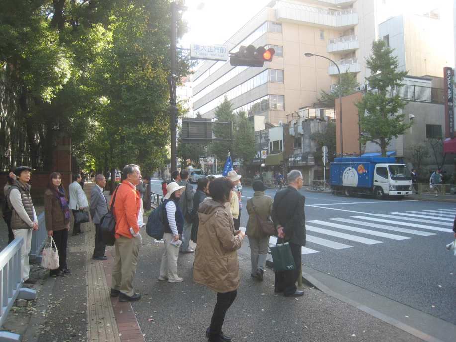 11月14日、旭川東高等学校東京同窓会第9回「さんぽを楽しむ会」は、「お茶の水・湯島・本郷」コースを、東高1期から27期までの総勢15名の参加で実施しました。当日はさわやかな秋晴れのさんぽ日和に恵まれました。今回も第3回より続いてわかりやすい説明が好評の郷土史家渡辺功一さんのご案内です。