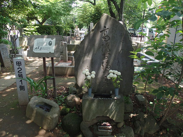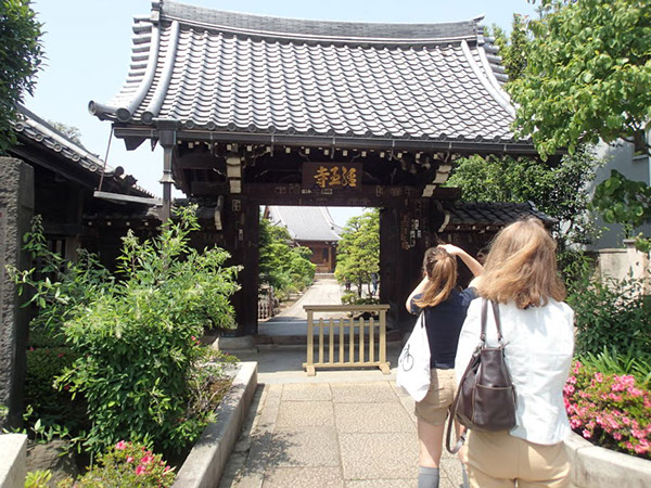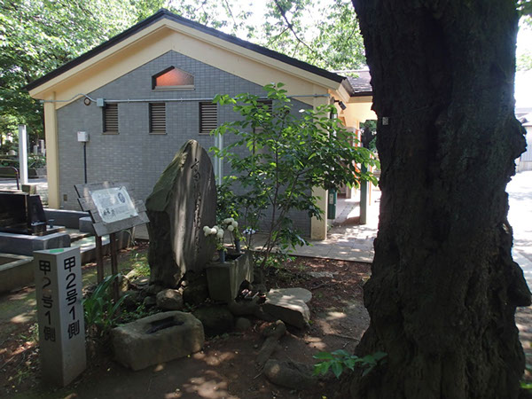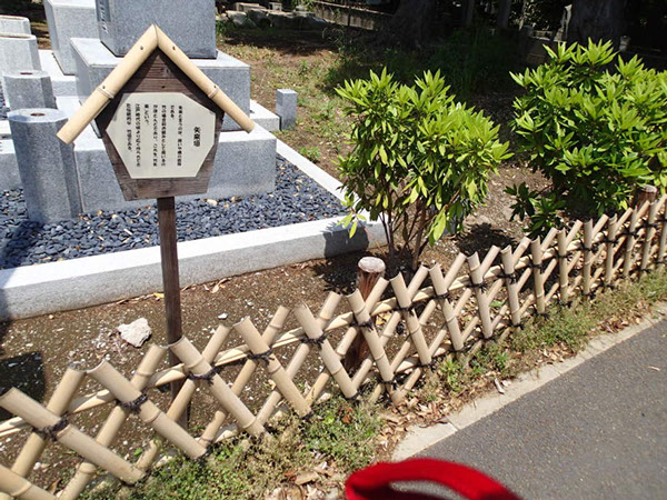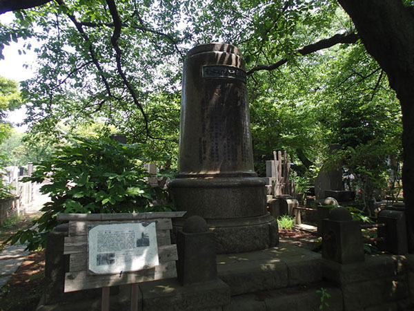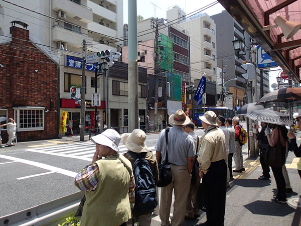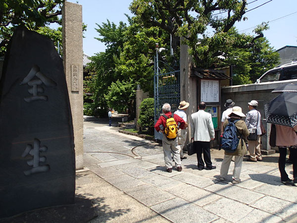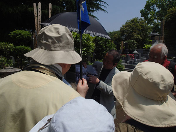 団子坂を下りて、旧藍染川の上のくねくねしたへび道をちょっとながめて、まっすぐ谷中霊園へ。途中、鈴木春信の錦絵で評判となった笠森お仙の碑のある大圓寺、さらに明治新政府で活躍した山岡鉄舟が開き、落語家三遊亭円朝の墓がある全生庵に立ち寄りました。谷中霊園では、なぜか涼しい風が吹く中、徳川幕府最後の将軍慶喜の墓参り。谷中霊園には長谷川一夫など多くの有名人が眠っています。また、幸田露伴の『五重塔』の小説で有名な天王寺五重塔跡もあります。関東一高い塔であったのが、昭和32年の放火で焼失という説明に「生まれていない」「東京に出て来た年だ」などそれぞれの感想を述べる一幕もありました。