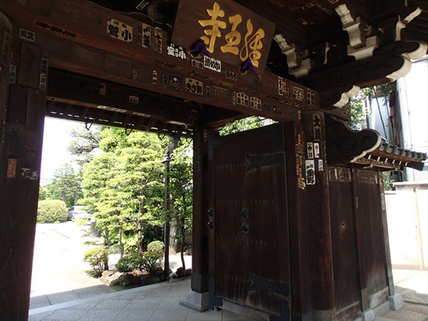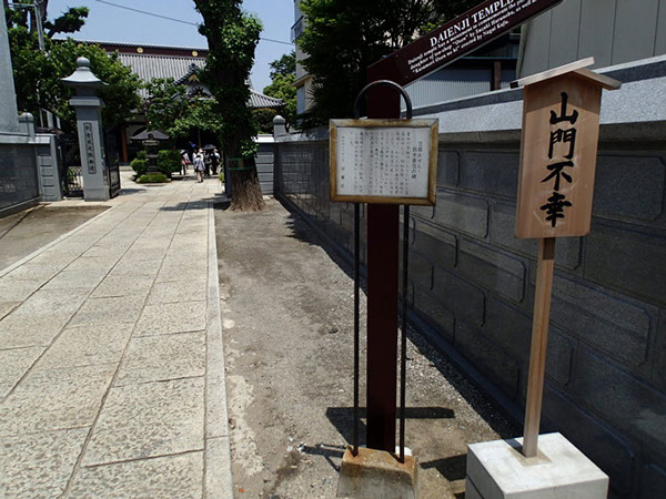 霊園を後にして、笠森稲荷があった功徳林寺、鎌倉・室町時代の板碑(卒塔婆の一種)と狩野芳崖の墓がある長安寺、江戸の風情を残す築地塀、赤穂浪士ゆかりの観音寺に立ち寄りながら、経王寺へ。経王寺の山門には、逃げ込んだ彰義隊へ向けて発砲した新政府軍の銃弾の跡が今も残っています。