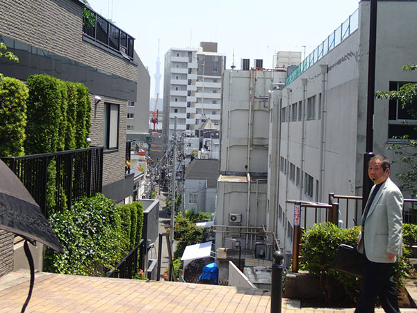 午前10時に地下鉄千代田線根津駅に集合。つつじで名高い根津神社へと向かいました。根津神社の現在の社殿は、5代将軍・徳川綱吉の造営で、境内に胞衣塚が残る6代将軍となった家宣生誕の場所でもあります。このあたりには、神社の賑わいとともに江戸時代から遊郭があったそうで、明治に入り、東京大学が近いため廃止されたという渡辺さんの話を聞きながら、次の目的地の文京区立森鷗外記念館へ向かいました。団子坂上に位置する鷗外の旧居「観潮楼」跡に建つ記念館は、鷗外生誕150年にあたる昨年11月に開館しました。当日は特別展「鷗外の見た風景-東京方眼図を歩く」という、さんぽを楽しむ会にぴったりな展覧会が開催中。方眼の地図を明治時代に企画したのは鷗外ということで、明治の東京を追体験できるというものでした。当時、観潮楼の2階からは品川沖が眺められたということですが、今は家の向こうにスカイツリーが見えます。