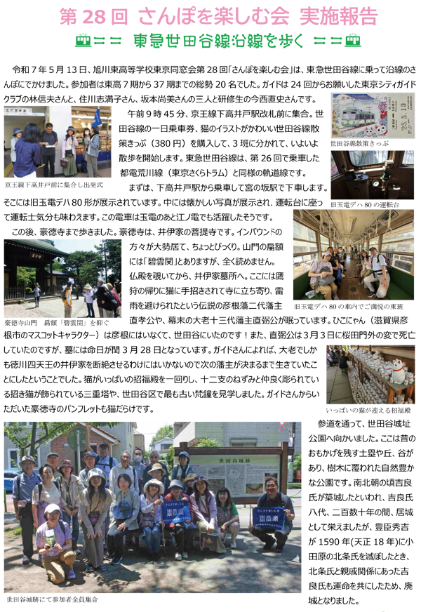 旭川東高等学校東京同窓会では「ゴルフ同好会」「囲碁同好会」「さんぽを楽しむ会」「テニス同好会」が元気に活動中!下のボックスをクリックすると、各同好会の一覧が表示されます。