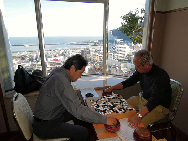 平成25年11月24日(日)~25日(月)に熱海ニューフジヤホテルにおいて、囲碁同好会恒例の合宿が行われました。今回で8回目になります。合宿には10名の会員が参加し、初日午後・夜と翌日午前の2日間にわたり、それぞれ7回の対局を行いました。熱戦の結果、5勝2敗の同率勝利者が3名出て、しかもお互いの直接対局が1勝1敗の巴状態となり、珍しい3名の同率優勝となりました。