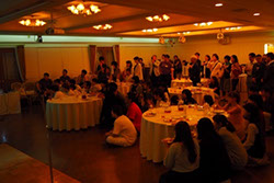 の自己紹介の時間です。1人32秒という微妙な時間での自己紹介をお願いしましたが、大学での活動や現在の生活の様子など、皆さん見事に32秒にまとめられ、堂々とした自己紹介となりました。20名ほどが終わったところで少し歓談の時間を取り、後半の自己紹介が行なわれ、諸先輩は大きな声援と温かい拍手で応え、大いに盛り上がりました。