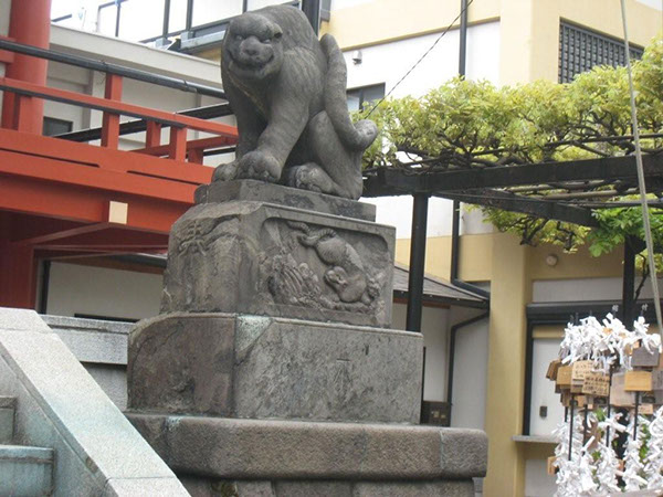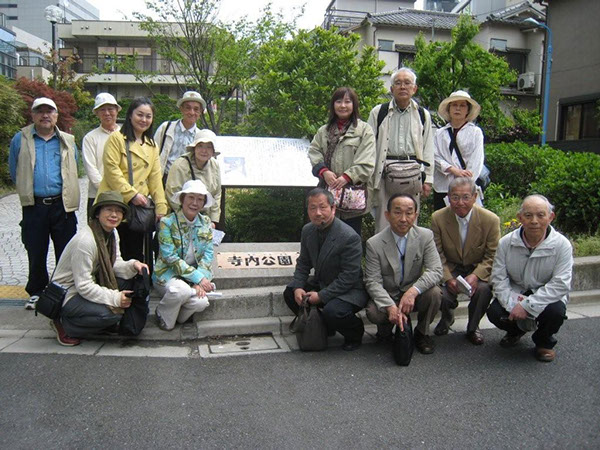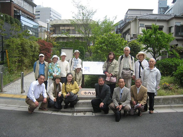 神楽坂を登り、毘沙門天へ。神楽坂の通りに面した毘沙門天は善國寺というれっきとしたお寺ですが、明るい感じの建物から神社と間違う方もいるとか。通りを渡り、入り組んだ細い路地に往時をしのばせ、黒塀の料亭がある本多横丁・かくれんぼ横丁・芸者新道へ。神楽坂が三業地として発展したもととなったという行元寺跡にできた超高層マンション脇の寺内(じない)公園で記念撮影。