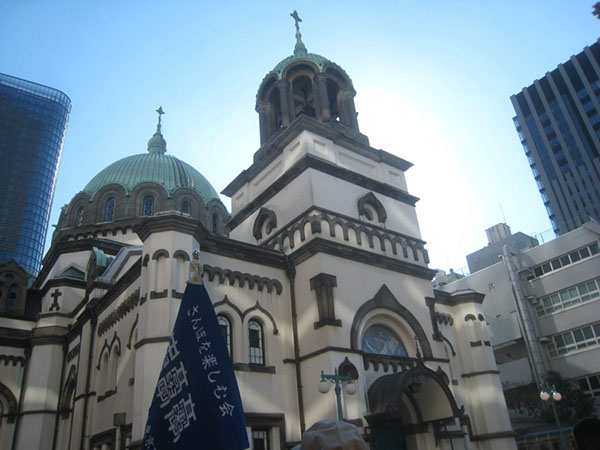 午前10時にJR御茶ノ水駅の御茶ノ水橋口集合。お茶の水橋のたもとの交番の裏には、お茶ノ水の碑があり、地名の謂れとなった将軍のお茶用の水として献上されたことがしのばれます。お茶の水橋から神田川を眺め、江戸時代に山を崩して堀を作ったため、現在の溪谷風の地形となったという説明を聞き、川を渡る地下鉄丸ノ内線の電車を眺めつつ、ニコライ堂へ。ニコライ堂は、正式名称を日本正教会東京復活大聖堂といい、国指定の重要文化財です。明治24年(1891)に大主教ニコライ・カサートキンによって建てられた緑色のドームを持つビザンティン様式の教会です。美しいステンドグラスは、外からではよくわかりませんでしたが、ご興味のある方は午後1時から3時半まで、聖堂内の一部を見学できるので、またの機会にどうぞ。
