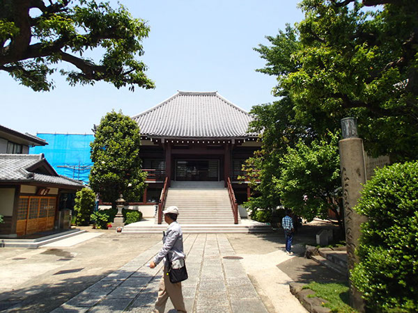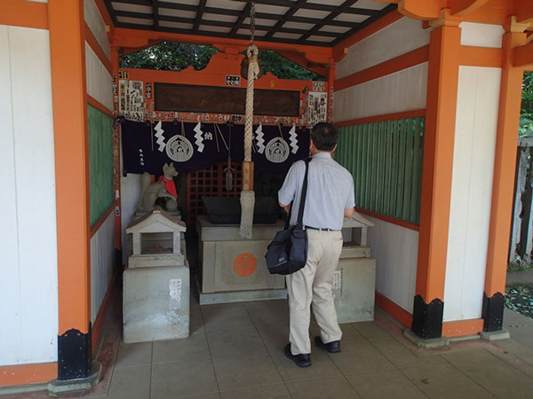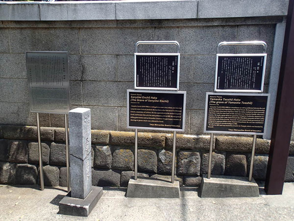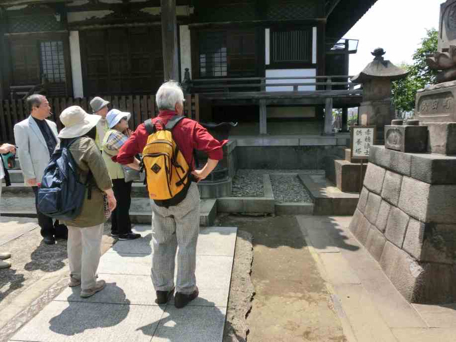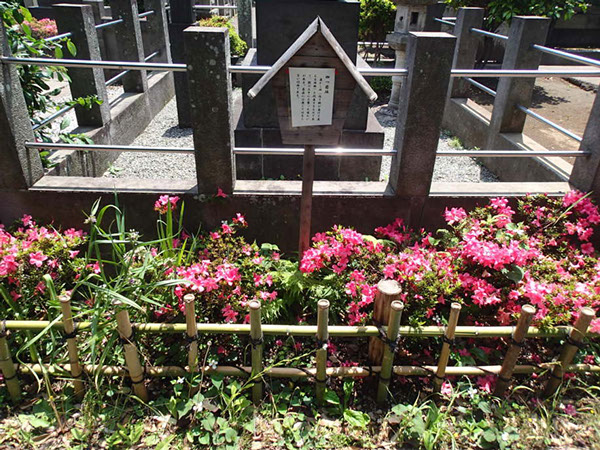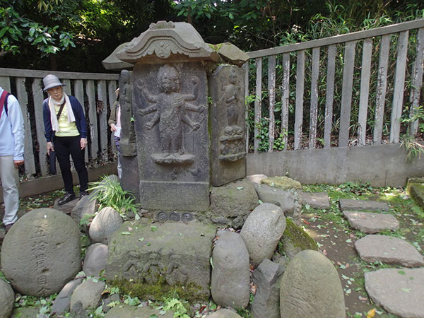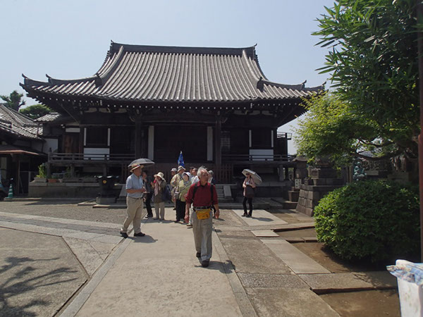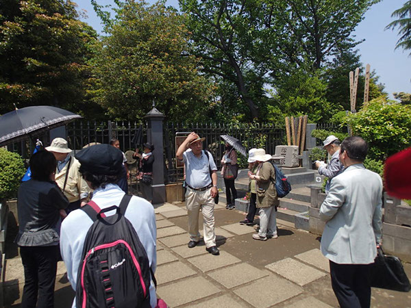 団子坂を下りて、旧藍染川の上のくねくねしたへび道をちょっとながめて、まっすぐ谷中霊園へ。途中、鈴木春信の錦絵で評判となった笠森お仙の碑のある大圓寺、さらに明治新政府で活躍した山岡鉄舟が開き、落語家三遊亭円朝の墓がある全生庵に立ち寄りました。谷中霊園では、なぜか涼しい風が吹く中、徳川幕府最後の将軍慶喜の墓参り。谷中霊園には長谷川一夫など多くの有名人が眠っています。また、幸田露伴の『五重塔』の小説で有名な天王寺五重塔跡もあります。関東一高い塔であったのが、昭和32年の放火で焼失という説明に「生まれていない」「東京に出て来た年だ」などそれぞれの感想を述べる一幕もありました。