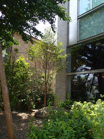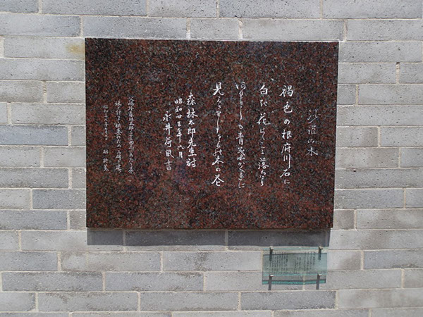 午前10時に地下鉄千代田線根津駅に集合。つつじで名高い根津神社へと向かいました。根津神社の現在の社殿は、5代将軍・徳川綱吉の造営で、境内に胞衣塚が残る6代将軍となった家宣生誕の場所でもあります。このあたりには、神社の賑わいとともに江戸時代から遊郭があったそうで、明治に入り、東京大学が近いため廃止されたという渡辺さんの話を聞きながら、次の目的地の文京区立森鷗外記念館へ向かいました。団子坂上に位置する鷗外の旧居「観潮楼」跡に建つ記念館は、鷗外生誕150年にあたる昨年11月に開館しました。当日は特別展「鷗外の見た風景-東京方眼図を歩く」という、さんぽを楽しむ会にぴったりな展覧会が開催中。方眼の地図を明治時代に企画したのは鷗外ということで、明治の東京を追体験できるというものでした。当時、観潮楼の2階からは品川沖が眺められたということですが、今は家の向こうにスカイツリーが見えます。