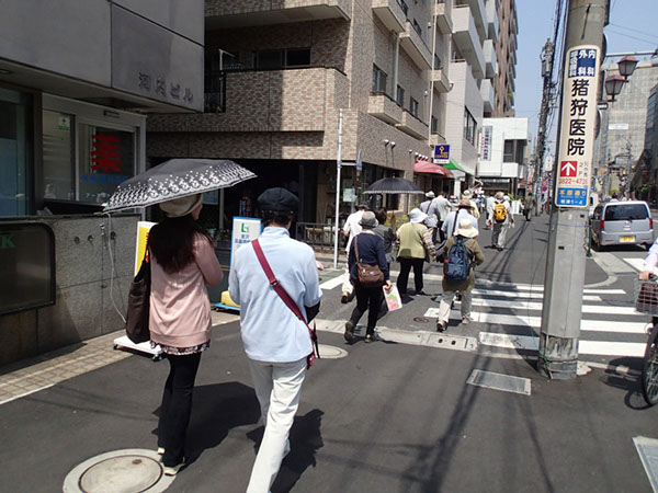 5月22日、旭川東高等学校東京同窓会第10回「さんぽを楽しむ会」は、下町の風情が残る「谷根千(谷中・根津・千駄木)」コースを、東高7期から27期までの総勢12名の参加で実施しました。当日はさわやかな初夏を思わせる好天に恵まれ、10回目の記念すべき会も楽しいひと時となりました。今回も第3回より続いてわかりやすい説明が好評の郷土史家渡辺功一さんのご案内です。