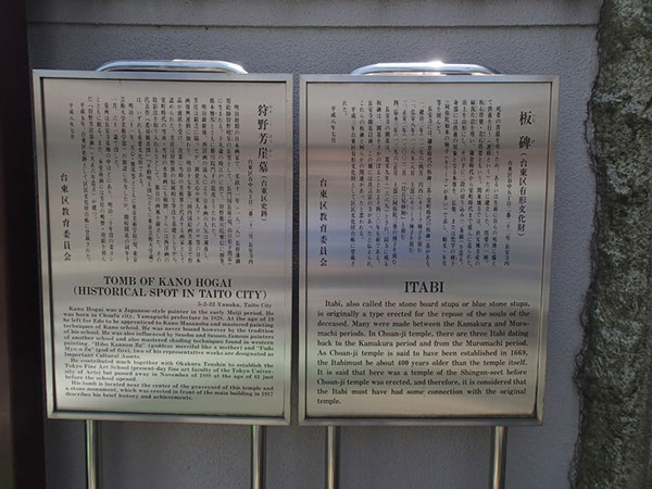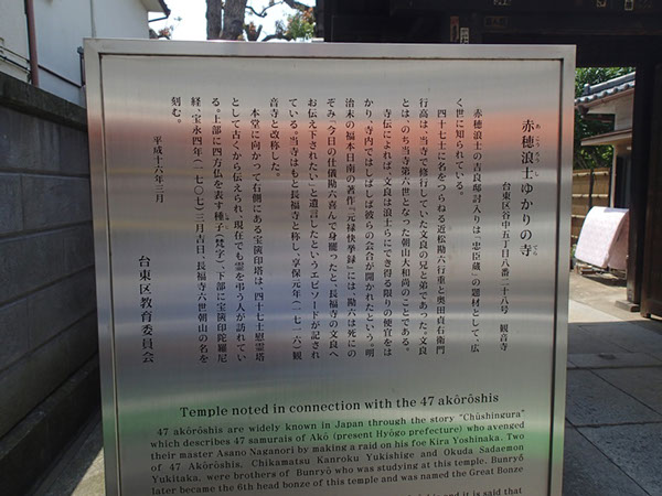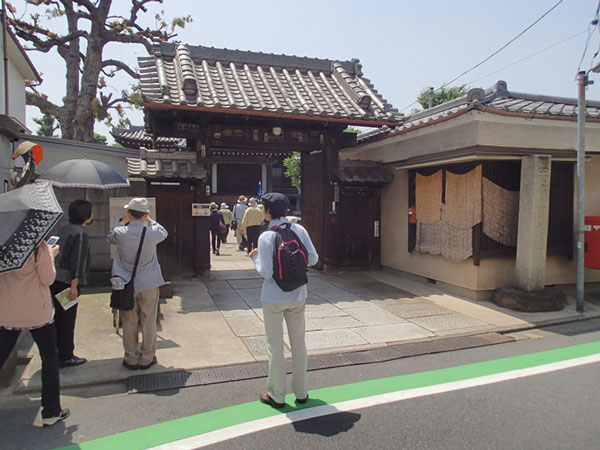 霊園を後にして、笠森稲荷があった功徳林寺、鎌倉・室町時代の板碑(卒塔婆の一種)と狩野芳崖の墓がある長安寺、江戸の風情を残す築地塀、赤穂浪士ゆかりの観音寺に立ち寄りながら、経王寺へ。経王寺の山門には、逃げ込んだ彰義隊へ向けて発砲した新政府軍の銃弾の跡が今も残っています。