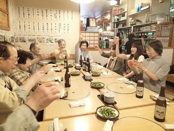 昼食は西日暮里駅近くの「玄海寿司」。おいしいお寿司に冷えたビールと枝豆、サラダ、ぶり大根、ホタルイカの沖漬けなどなど。15期朝比奈幹事の交渉力で、リーズナブルでボリュームたっぷりの昼食をいただきました。