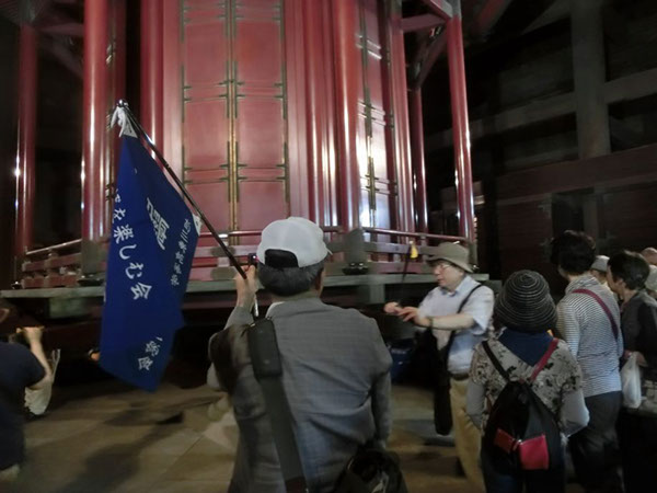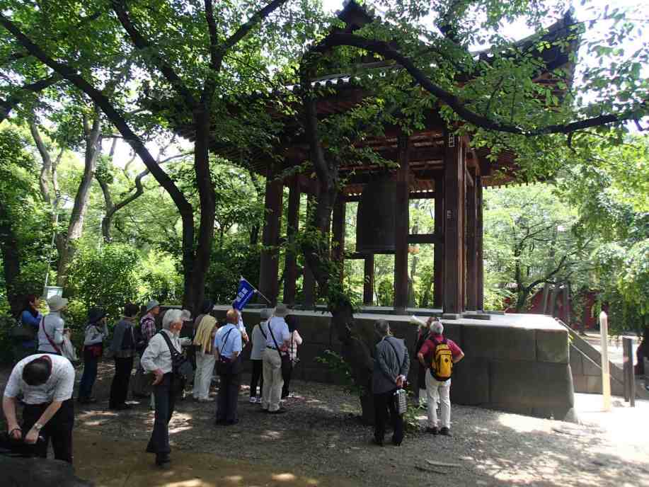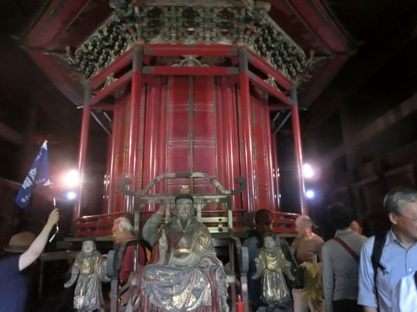次に向かったのは、徳川家康公が尊崇した黒本尊と呼ばれる阿弥陀如来の秘仏が安置されている安国殿。そこには和宮の銅像や焼け残った徳川将軍の位牌もありました。安国殿から江戸っ子の鐘と親しまれた大きな鐘がある鐘楼堂へ向いました。あまりの大きさに運搬が困難だったため、第二次世界大戦の際も供出を免れたといいます。江戸の街に朝夕に時を告げた鐘は、「今鳴るは芝か上野か浅草か」と川柳に謳われたものです。国指定重要文化財の朱塗り三門(三解脱門)の前を通り、経蔵へ。経蔵には家康公が集めた宋版・元版・高麗版の大蔵経(国指定重要文化財)が納められていました。内部中央には八角形の輪蔵があります。輪蔵は回転式書架で、回転させるとそれだけで経典を読んだことになるというものです。頑丈な作りなので回しても大丈夫とのことなので全員で回し、5000巻余の経典を読んだことになりました。