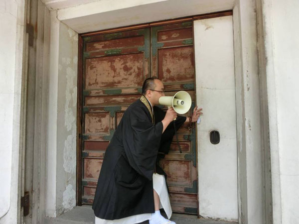 経蔵扉を開けながら説明の僧侶