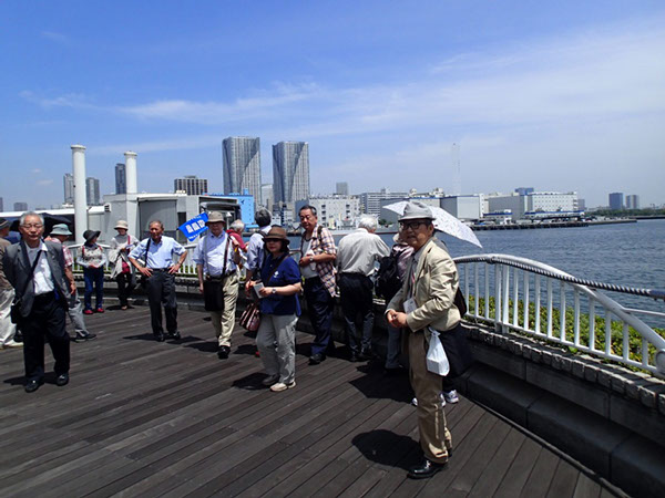 整備された海上公園で、御座船安宅丸や松本零士プロデュースのホタルナが舫う日の出桟橋や、遠くのレインボーブリッジ、フジテレビ本社ビルを眺めました。海辺から旧芝離宮恩賜庭園前を通って、昼食会場へ向かいました(予定していた旧芝離宮恩賜庭園は、時間の都合で割愛)。昼食は、北海道グルメ日本橋亭浜松町店で、近況報告などで談笑し、美味しい食事とアルコールを満喫しました。最後に朝比奈幹事の相撲甚句「東京名所」で締めくくりました。