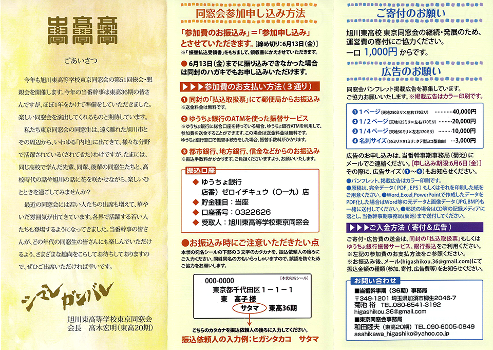 今年も旭川東高等学校東京同窓会の第51回総会・懇親会を開催します。今年の当番幹事は東高36期の皆さんですが、ほぼ1年をかけて準備をしていただきました。楽しい同窓会を演出してくれるものと期待しています。