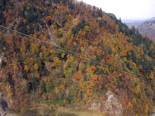 層雲峡は、旭川へ来て初めての観光となります。層雲峡まで道のりの小高い山々はすでに紅葉していて、きれいです。こちらの紅葉は、赤系が少なく黄色系と