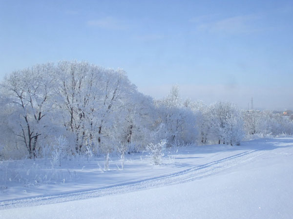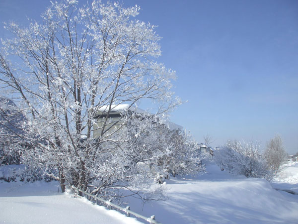 まわりの木々は、樹氷が真っ白につき、電線にも樹氷がついて白い電線になっています。