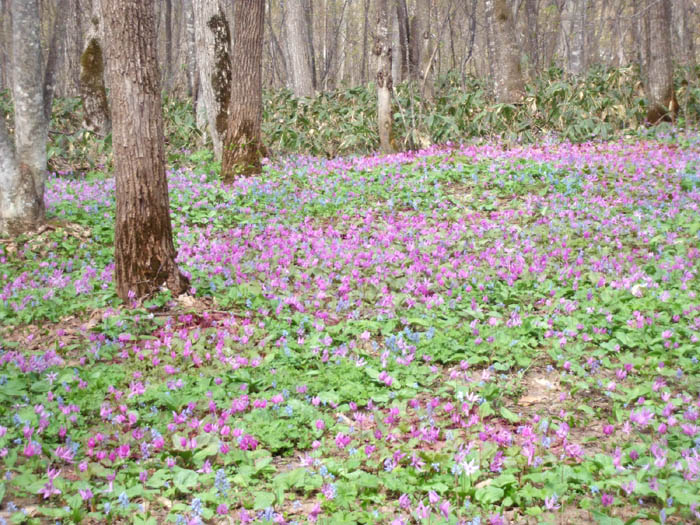 野草が群生する突哨山には、カタクリ・エゾエンゴサク・ニリンソウなどが満開